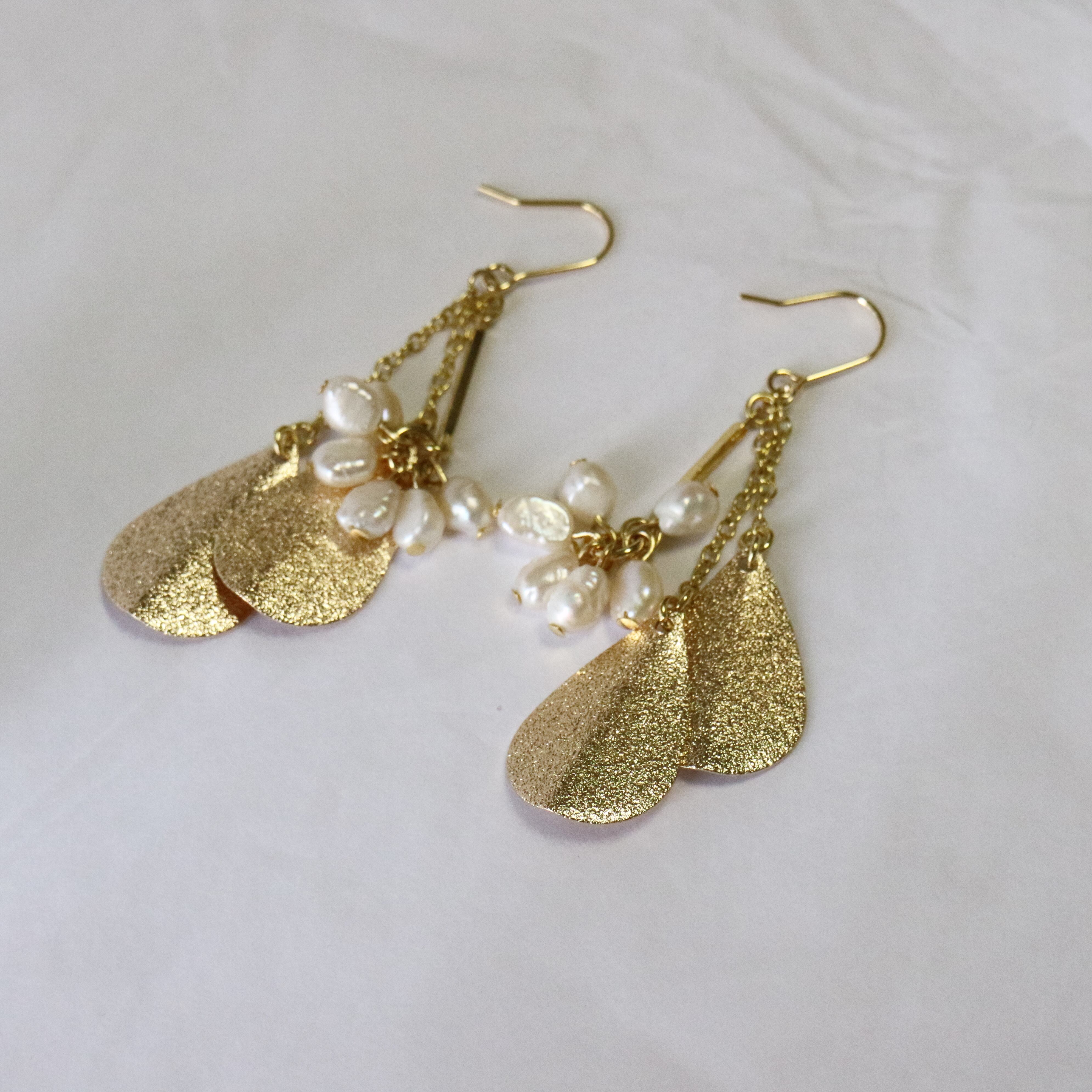 淡水パールとリーフパーツで、上品さと可愛らしさが相まったデザインです。ゴールドのパーツはキラキラ、シャラシャラと、とても綺麗に輝きます。清楚な装いにも、ラフな普段使いにも馴染むアイテムです。