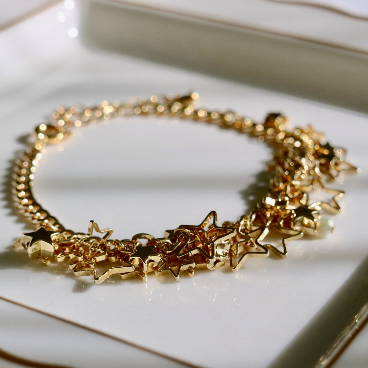 様々な形の星形パーツをふんだんに使ったブレスレットです。軽めの服装が増えるこれからの季節、手首で上品に煌めくアイテムです。