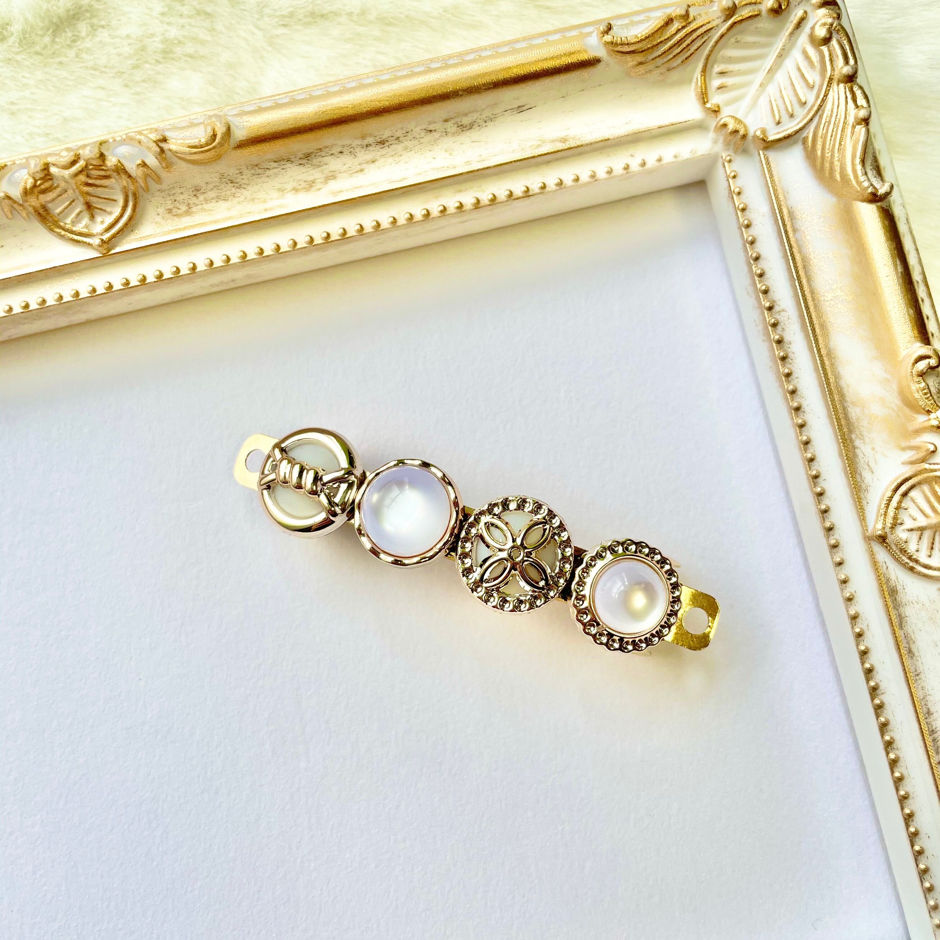 様々なデザインのボタン風カボションとバレッタを合わせました。パンツスタイル、スカートスタイル、どちらにもしっかりと馴染むアイテムで、場所を選ぶことなく使用できます。