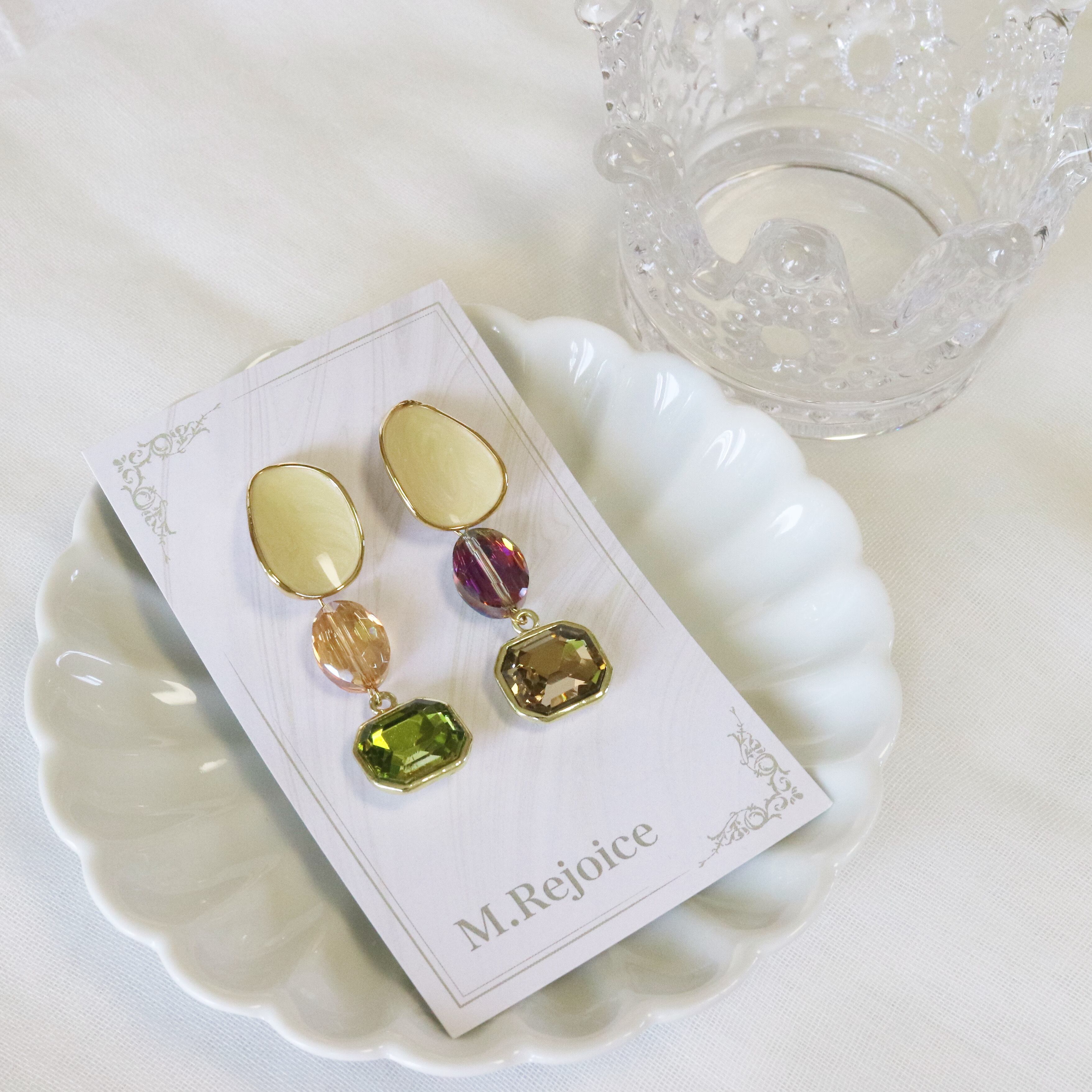 シンプルながらカラフルなストーンを合わせることで、上品な綺麗さを演出しました。左右で色味が違うアシンメトリーデザインで、さらにオシャレさを演出しています。金具がストーンの裏側に隠れているため、全体的に綺麗に見えるようなデザインです。