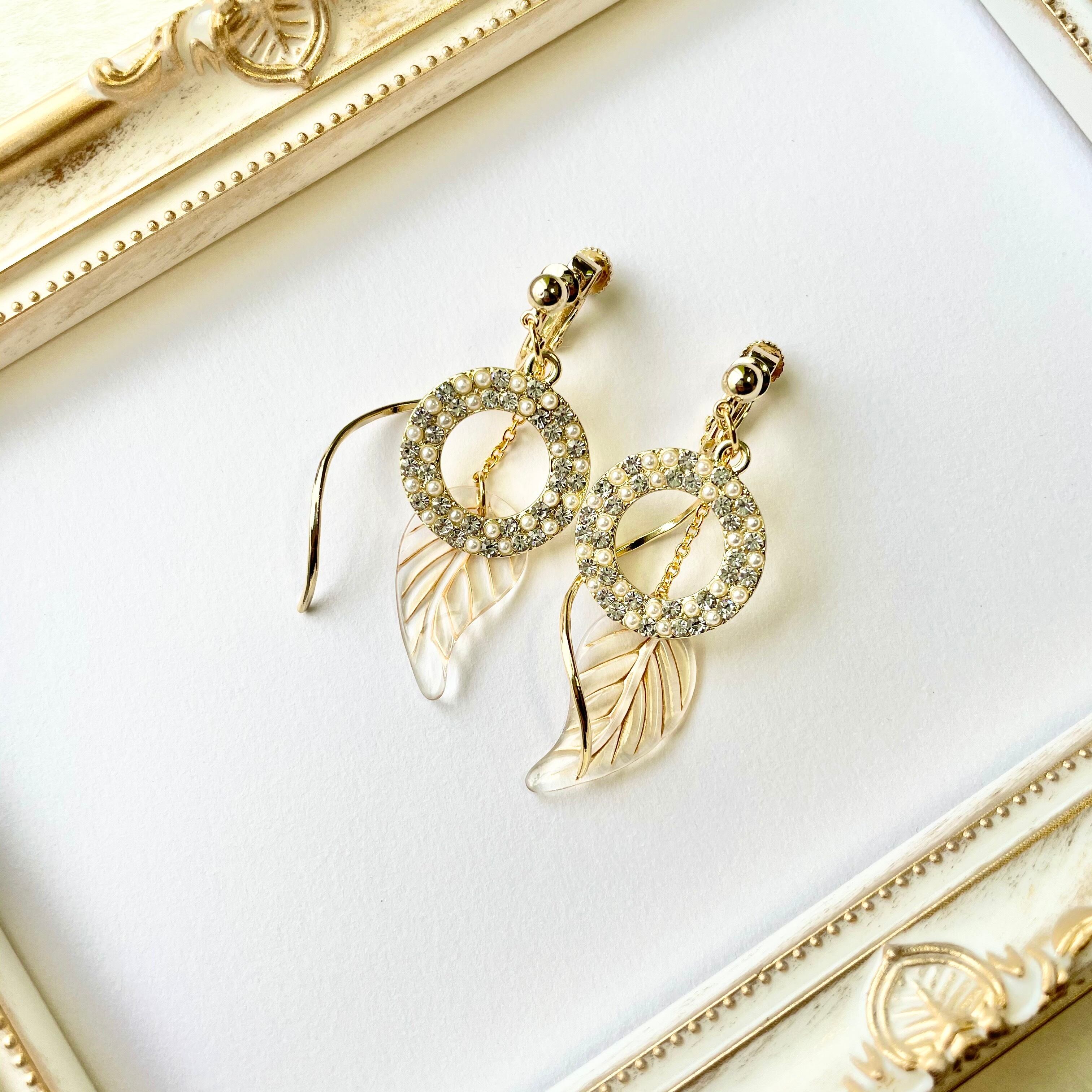 リースのような形のキラキラしたモチーフが印象的なイヤリングです。ゆらゆらと揺れるパーツで作られているので、動くたびに綺麗が更新されます。