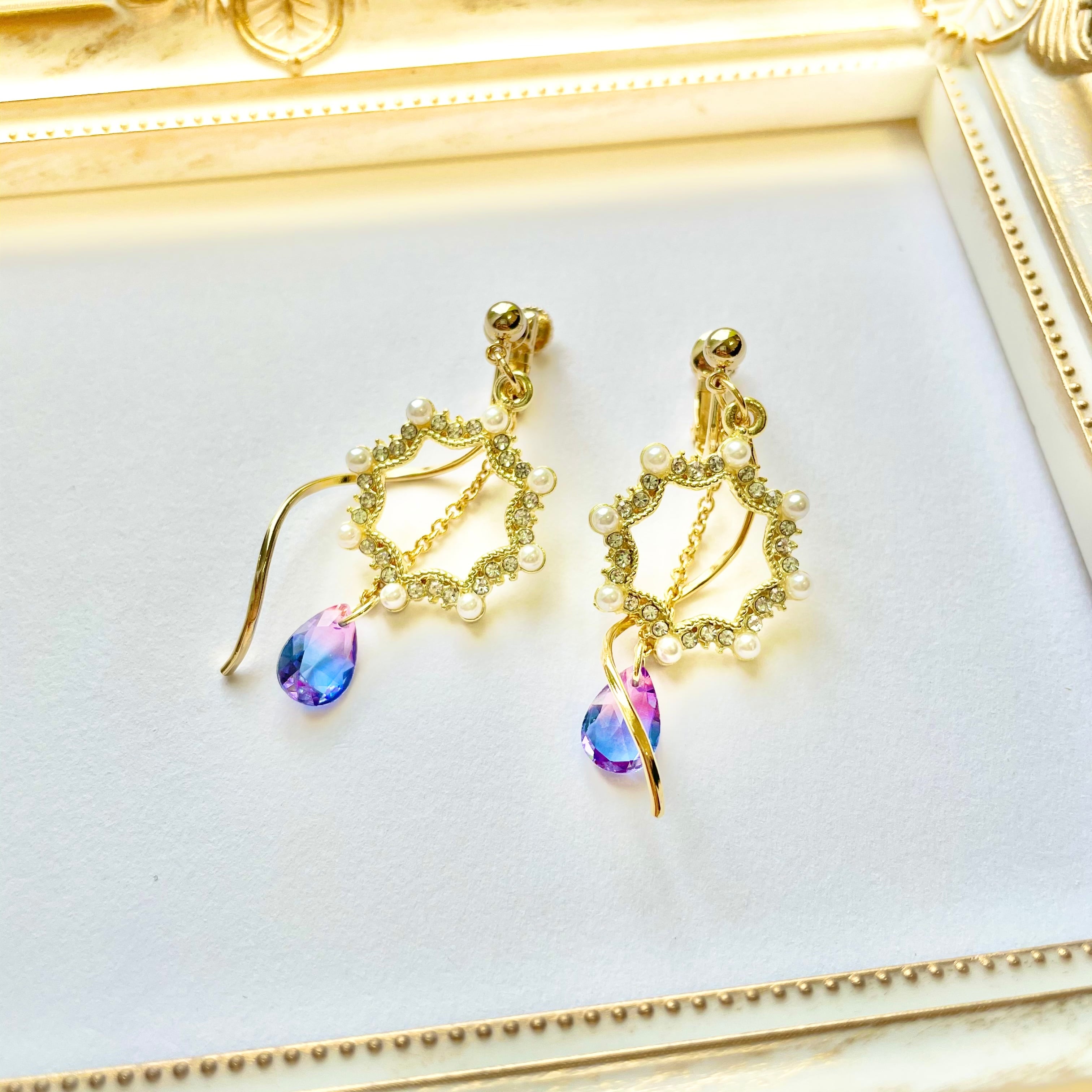 キラキラとしたリース風パーツと、爽やかな色合いのしずくチャームがアクセントとなっているアイテムです。上品で可愛らしく、クールな一面も持ち合わせたデザインは、着けるとまるでシンデレラ姫になったような気持ちになれます。