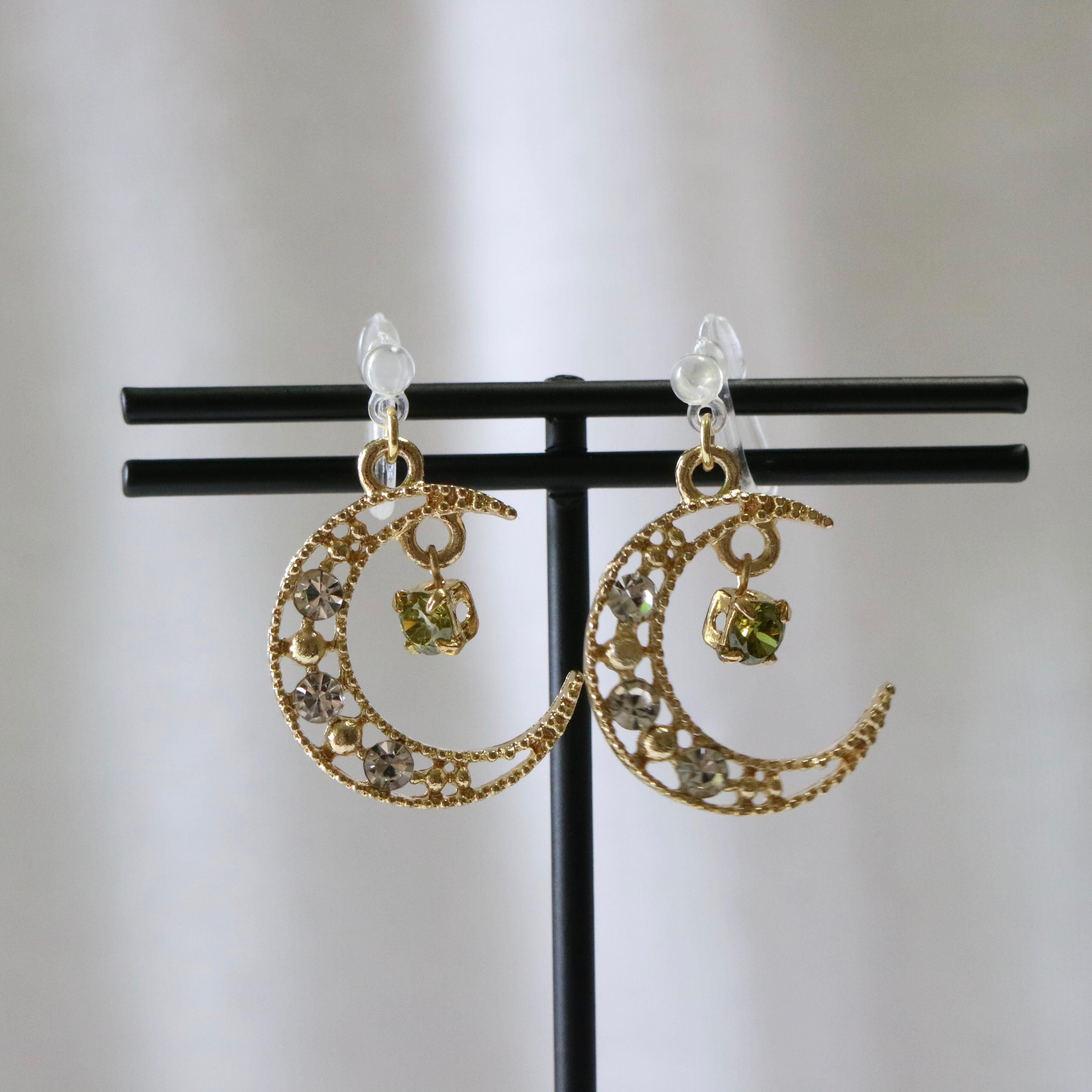 緑色のキラキラと輝くストーンがワンポイントの三日月イヤリングです。シンプルなデザインなので、場所を選ばずに着けることができます。ヘビロテ間違いなし!