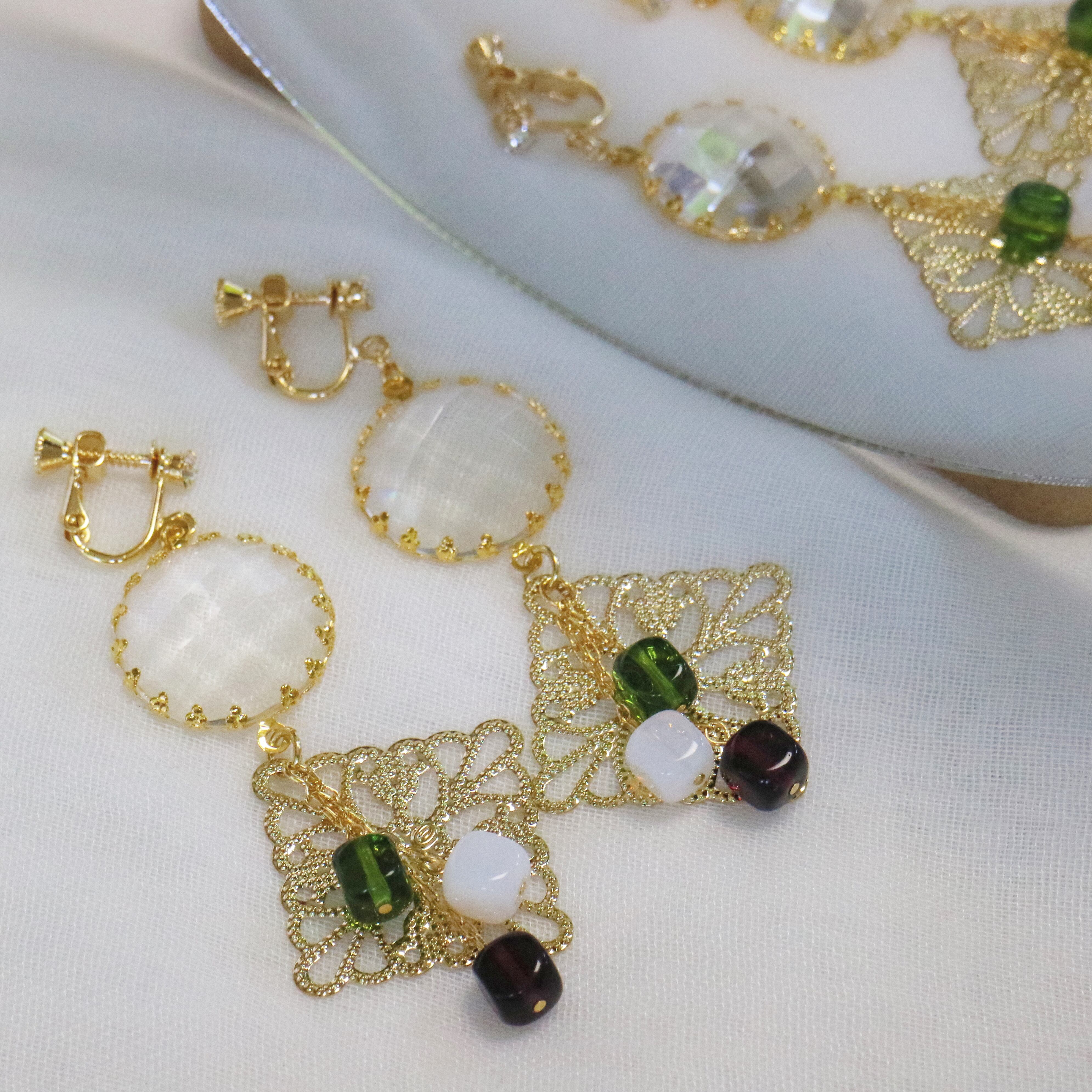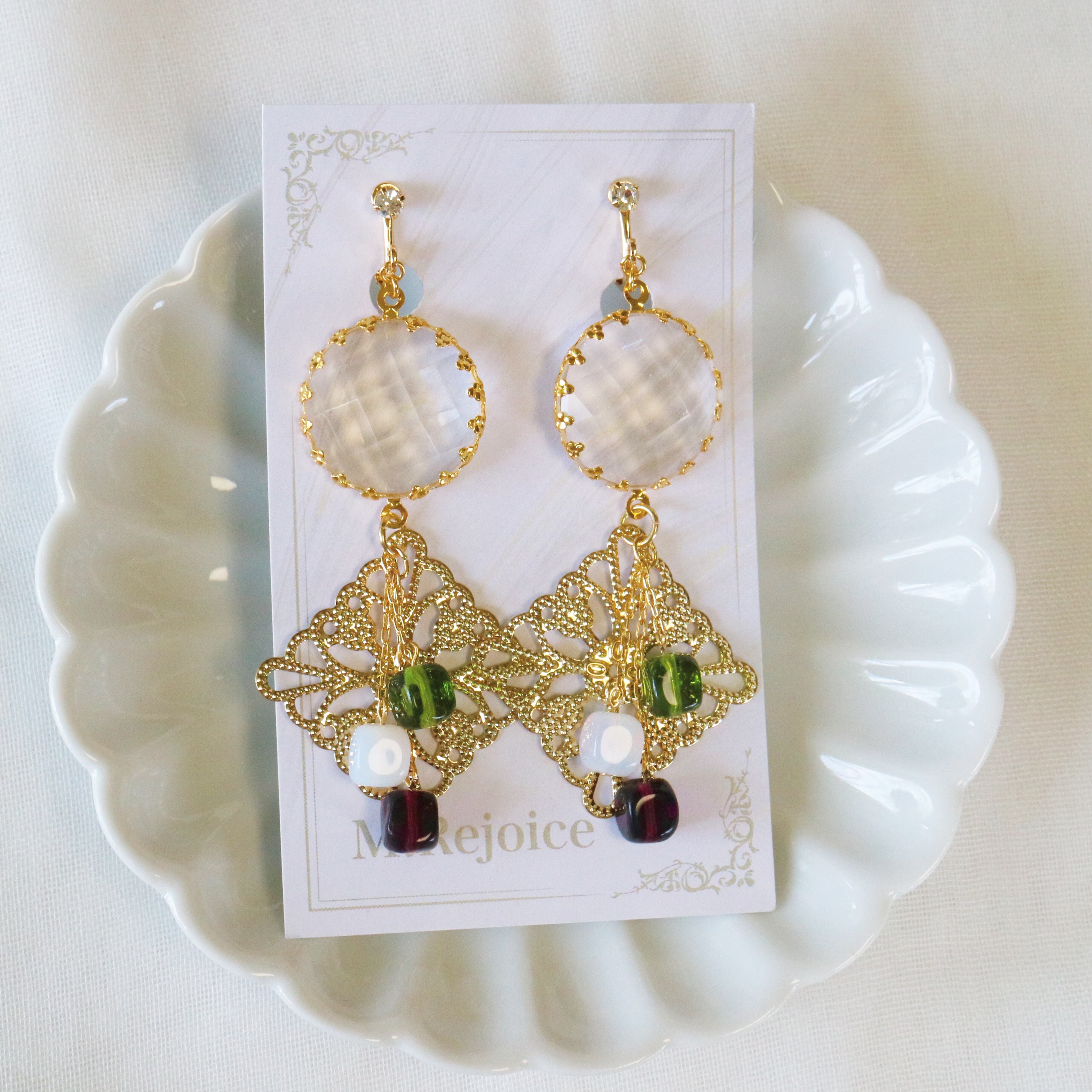 [ゴージャスグラス] キラキラガラス風パーツと大きな透かしパーツがアクセントのイヤリング