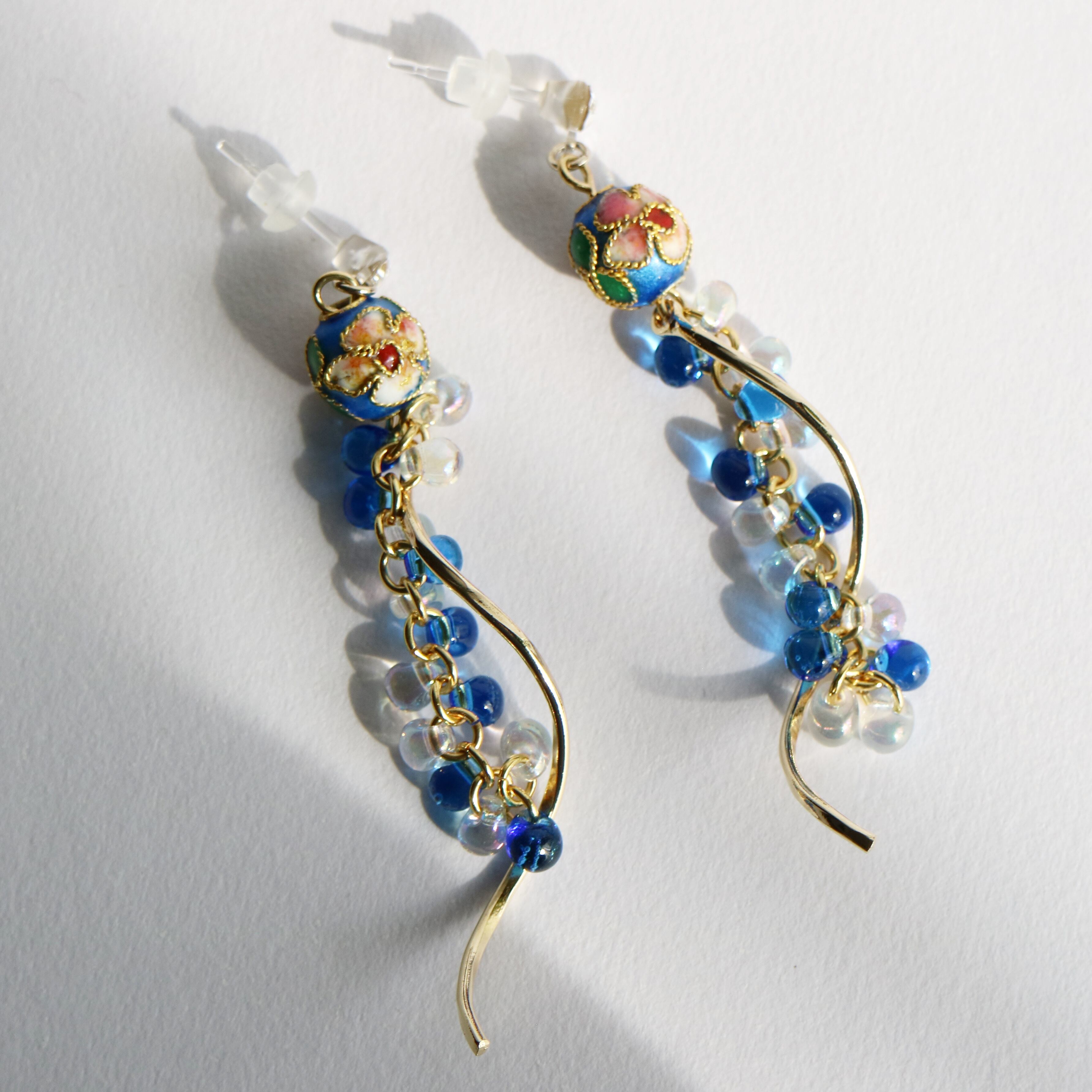 [チャイニーズブルー] お花模様のビーズがかっこいいゆらゆらロングピアス