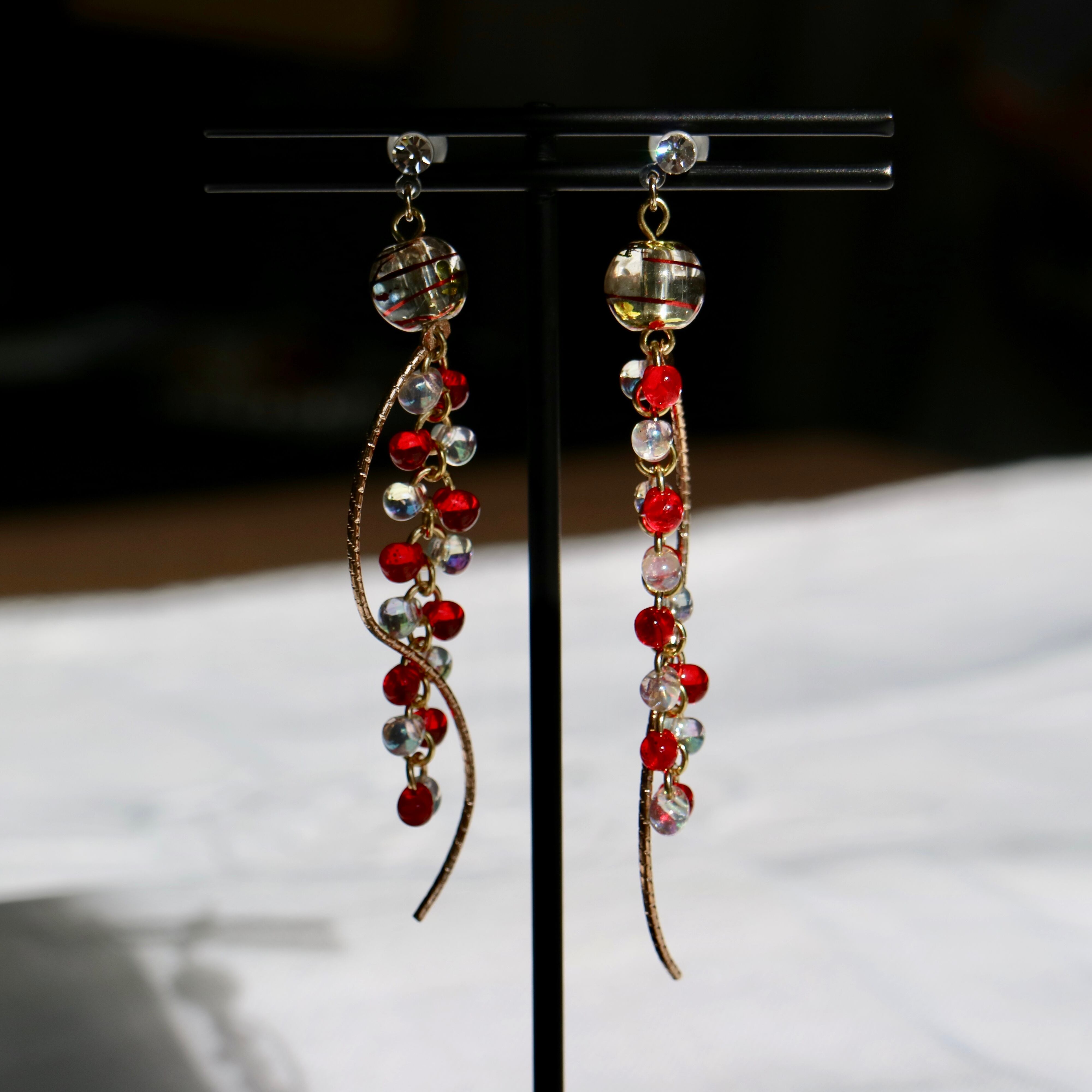 赤色がパッと目を惹く華やかなイヤリングです。綺麗な模様が施されたガラス玉とキラキラ光るスウィングパーツ、赤と白のガラスビーズは最高のバランスでマッチしています。