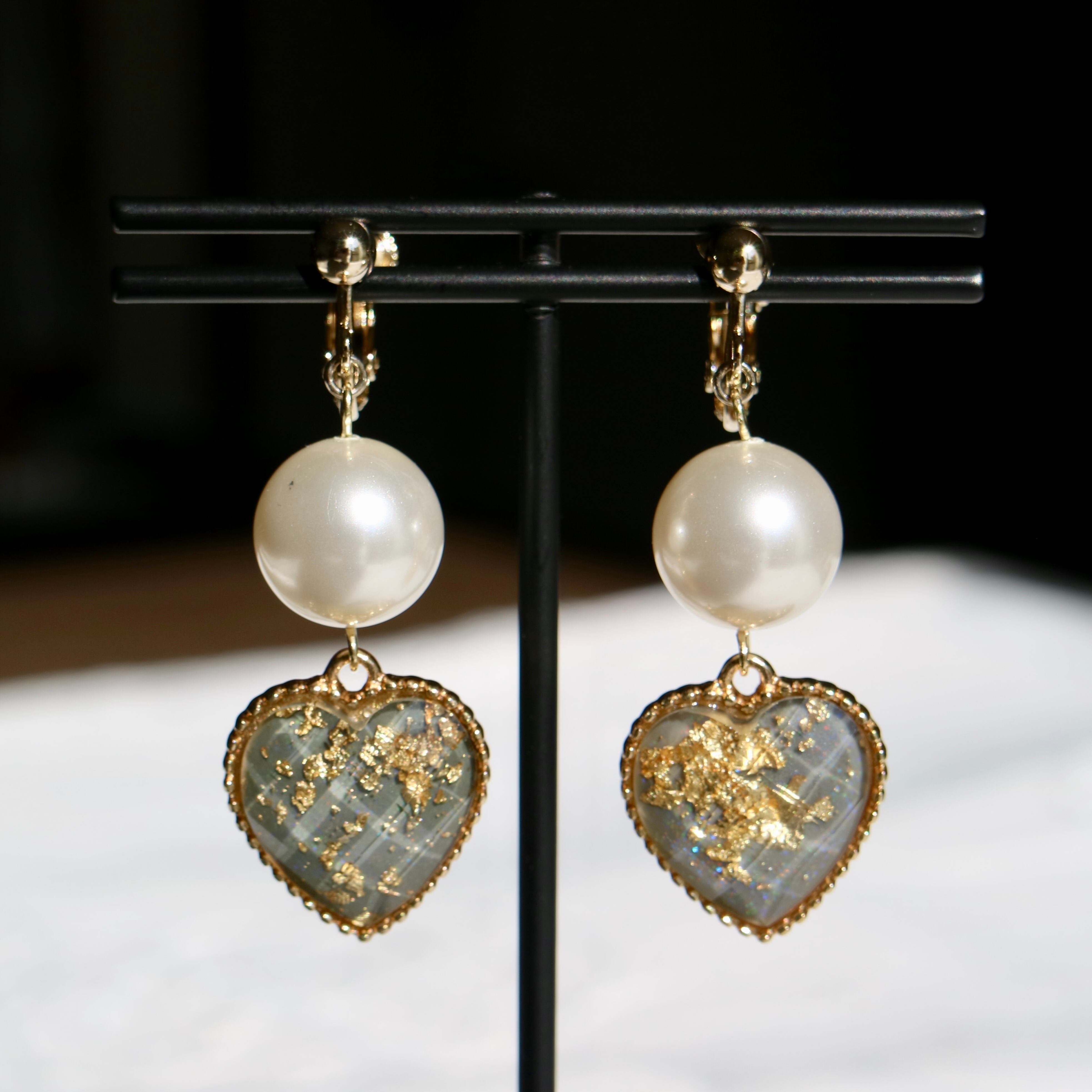金箔入りのハートチャームが目を惹くイヤリングです。これからの季節にぴったりの色味なので、寒い季節もお出かけが楽しくなります。10mmのスワロパールを使うことで、上品な輝きも増しています。