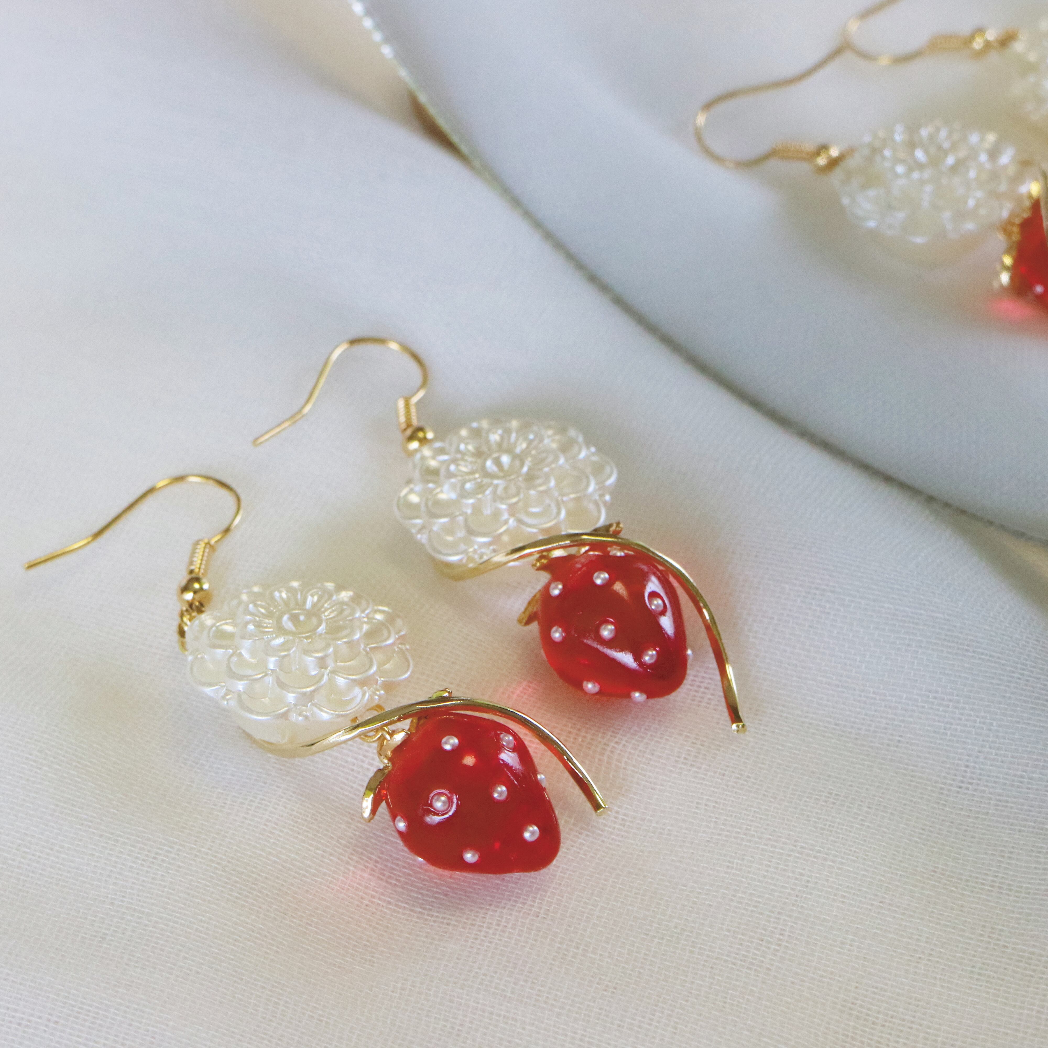 白いお花と真っ赤なイチゴが可愛らしいピアスです。ゆらゆらと可愛く揺れるデザインは、お顔周りを明るく彩ります。