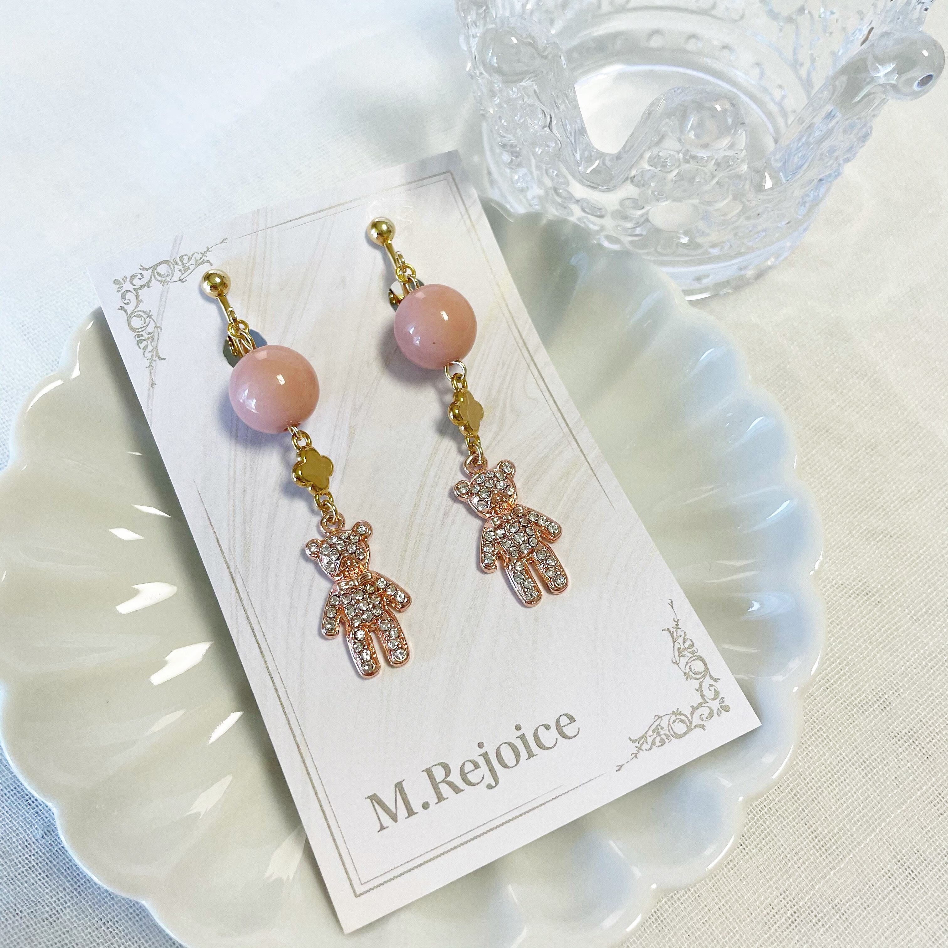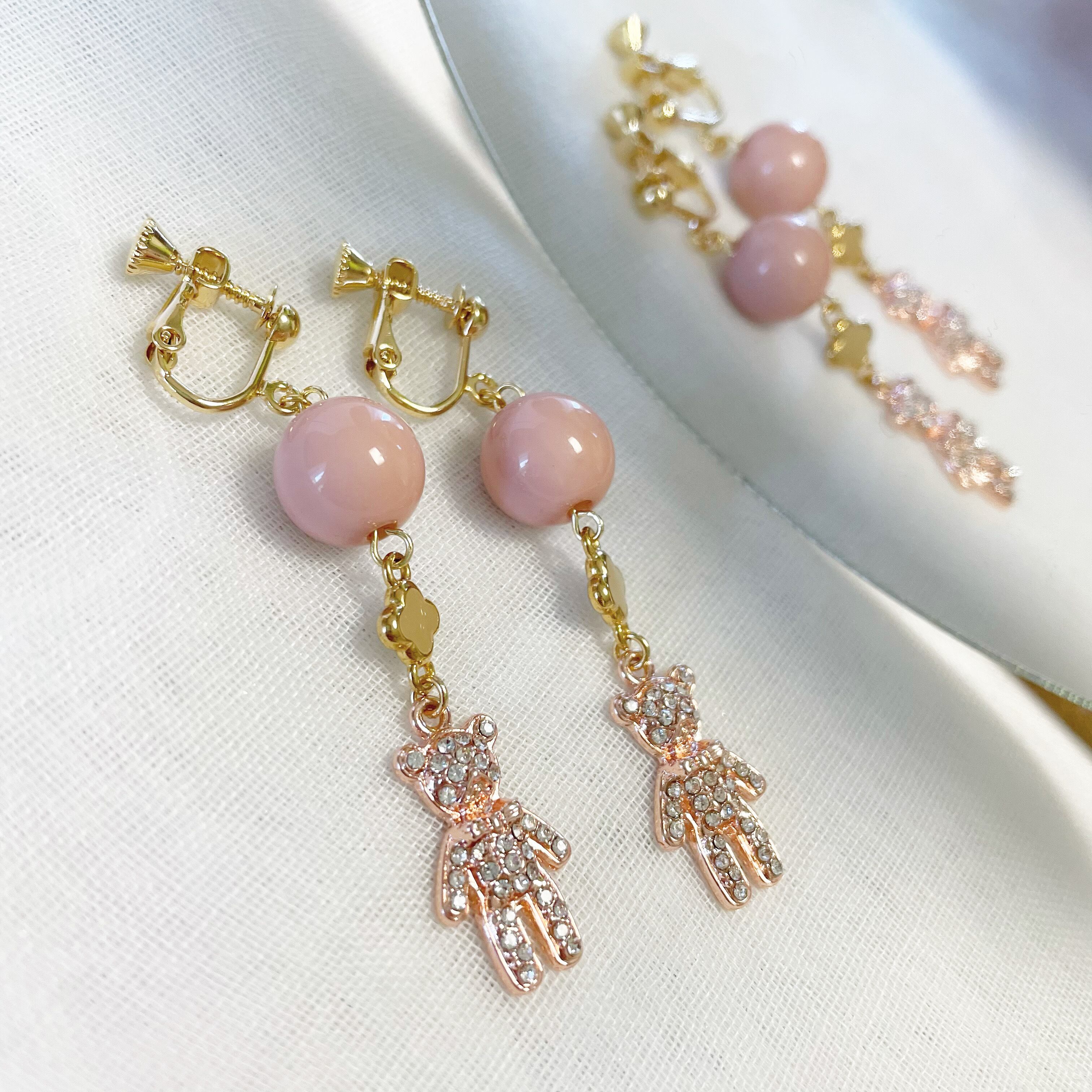 キラキラのストーンが埋められたクマモチーフが可愛らしいイヤリングです。ピンクのビーズと合わせることで、甘さをプラスしています。フェミニンな服装にとてもマッチします。