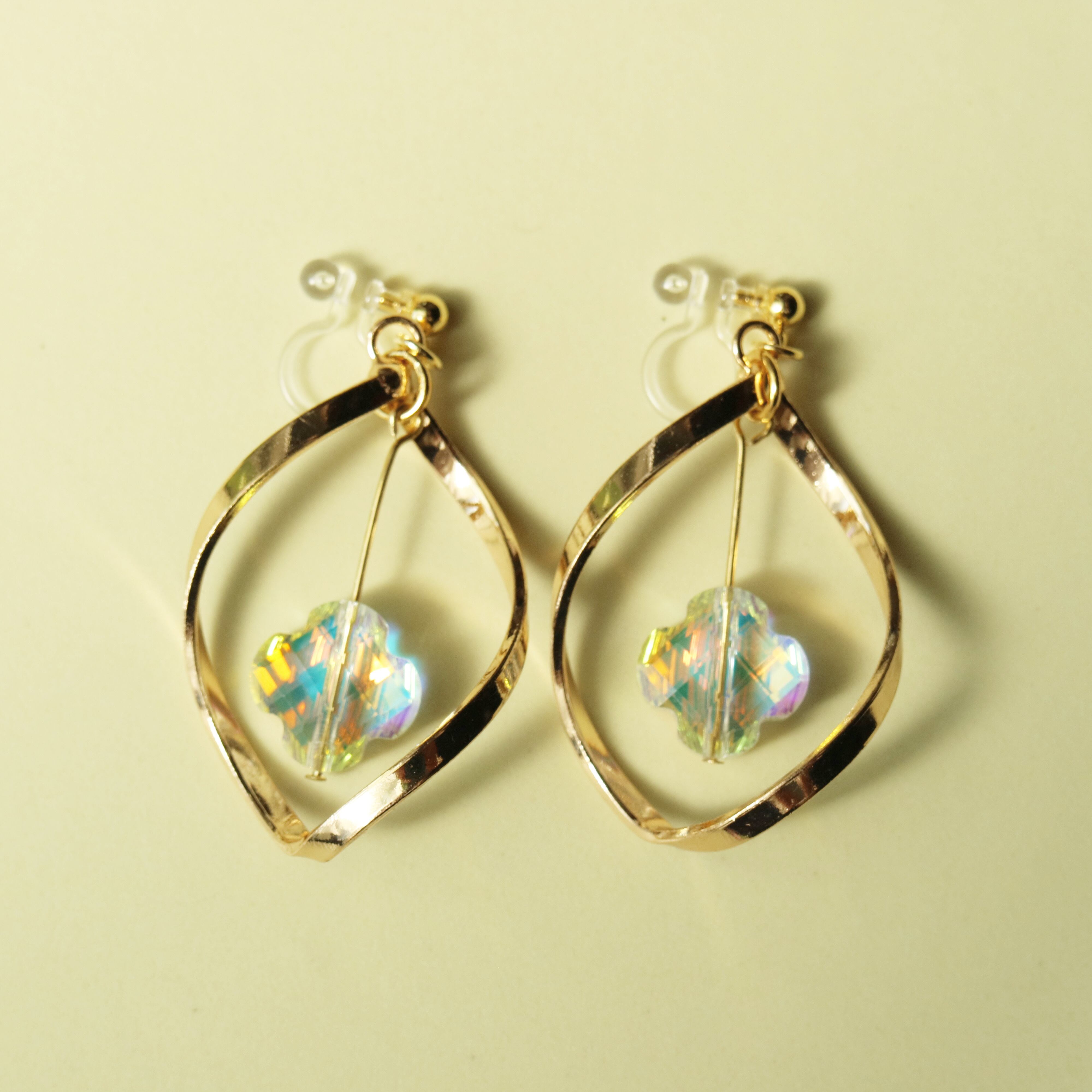 レインボーに輝くガラスビーズと、それを包むようなゴールドのパーツがキラキラと輝くとても綺麗なイヤリングです。シンプルで上品なデザインなので、普段使いはもちろん卒業や入学式などフォーマルシーンでもお使いいただけます。