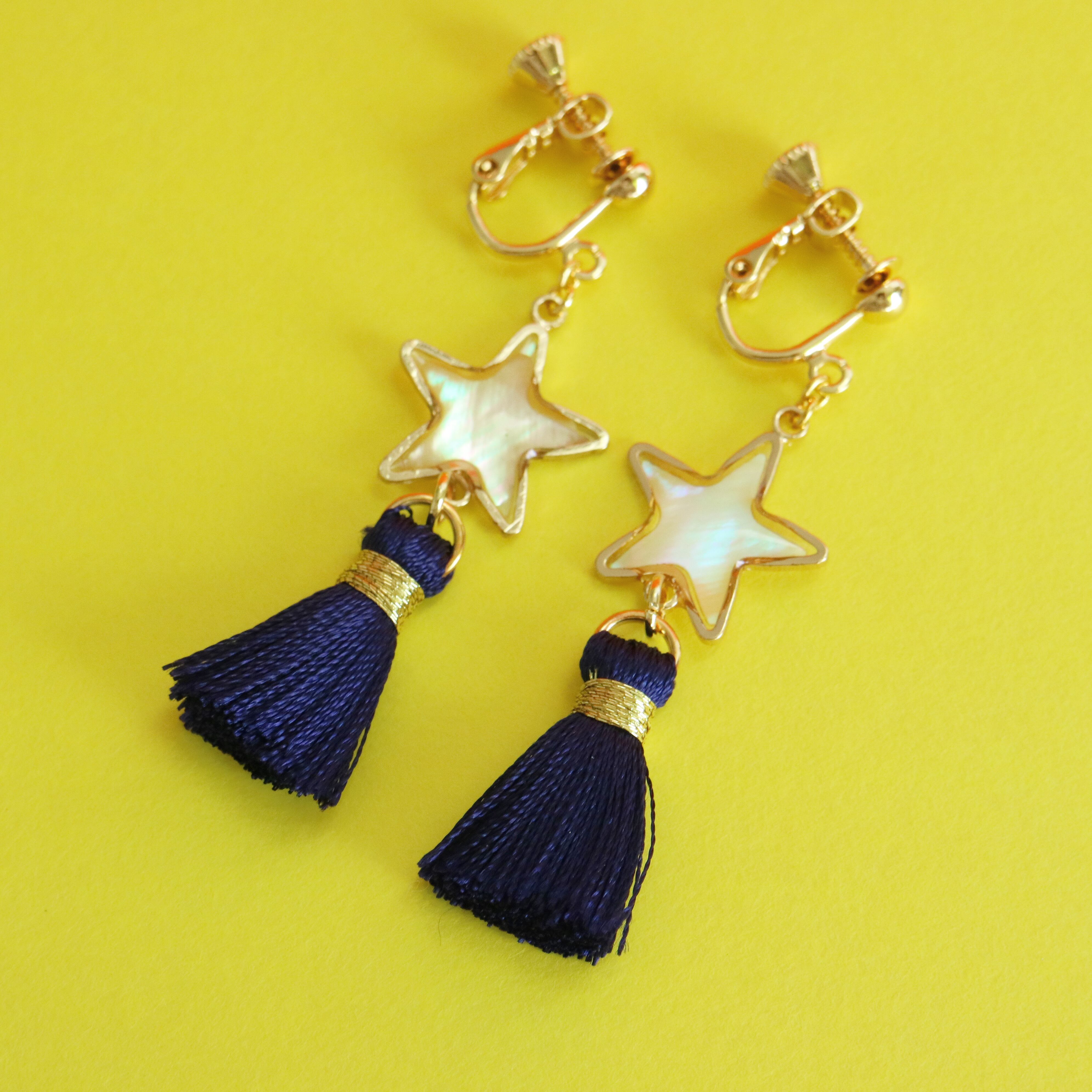 キラキラのお星さまチャームとネイビータッセルの組み合わせが可愛らしいイヤリングです。流れ星に願い事をするように、このイヤリングと毎日一緒に楽しく生活すると、いいことが起きるかも?