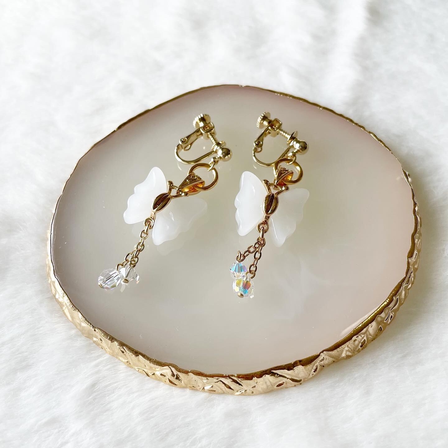 真っ白な蝶々とキラキラのビーズが綺麗に輝くイヤリング。