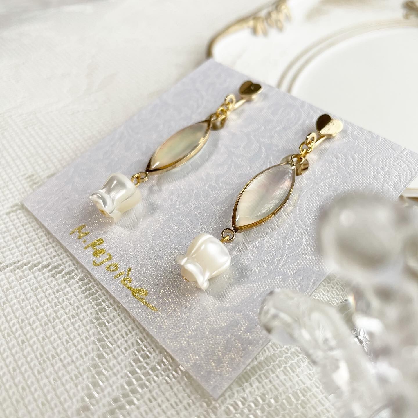 シェルで作られたスズランと、オパールのように様々な色に輝くパーツが綺麗なイヤリングです。